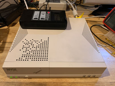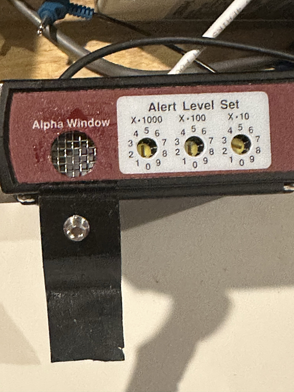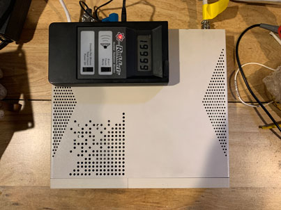 The generator machine is an old Wyse/Netier thin client running Debian Linux and modified to run off of an 8 Gbyte Compact Flash card. No moving parts! The radiation source is an Americium 241 capsule from a smoke detector (an alpha emitter) taped against the mica alpha window of the halogen-quenched Geiger counter. This results in extremely high radiation counts without saturating the tube. The random number generation rate is about 68 bytes/sec.